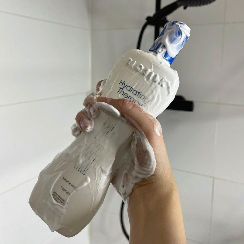 Schritt 1: Wasche dein Haar am besten vorher mit dem Biosilk Hydrating Therapy Shampoo.