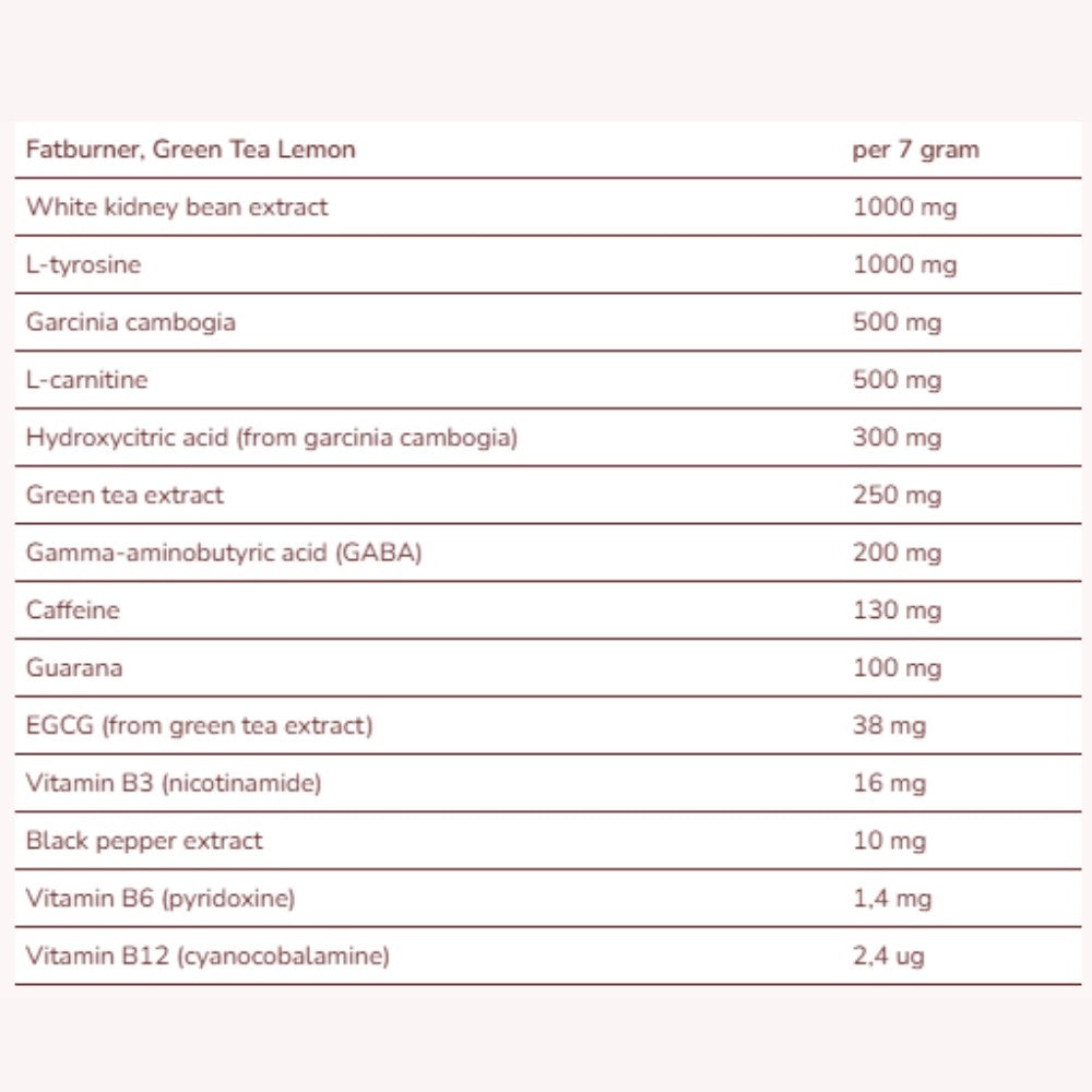 Maltodextrin, L-Tyrosin, Extrakt aus weißen Kidneybohnen, natürliches Aroma, L-Carnitin, Garcinia Cambogia, Säure: Zitronensäure, Grüntee-Extrakt, Gamma-Aminobuttersäure (GABA), wasserfreies Koffein, Aroma, Süßstoff: Sucralose, Guarana-Extrakt, Farbstoff: blaue Spirulina, Vitamin B3 (Nicotinamid), Farbstoff: Kurkuma, schwarzer Pfefferextrakt, Vitamin B6 (Pyridoxin), Vitamin B12 (Cyanocobalami).