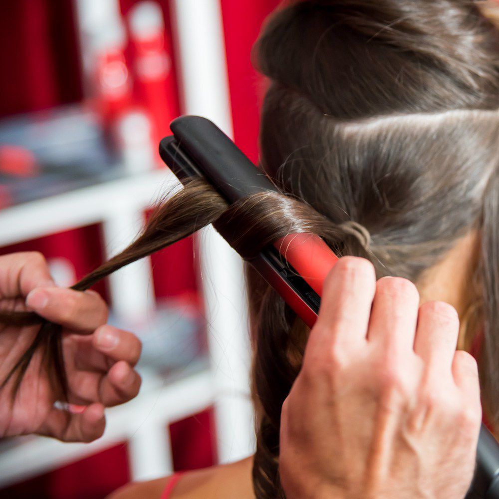 Schritt 1: Trage ein Hitzeschutzmittel auf dein Haar auf und stelle die gewünschte Temperatur am Glätteisen ein.