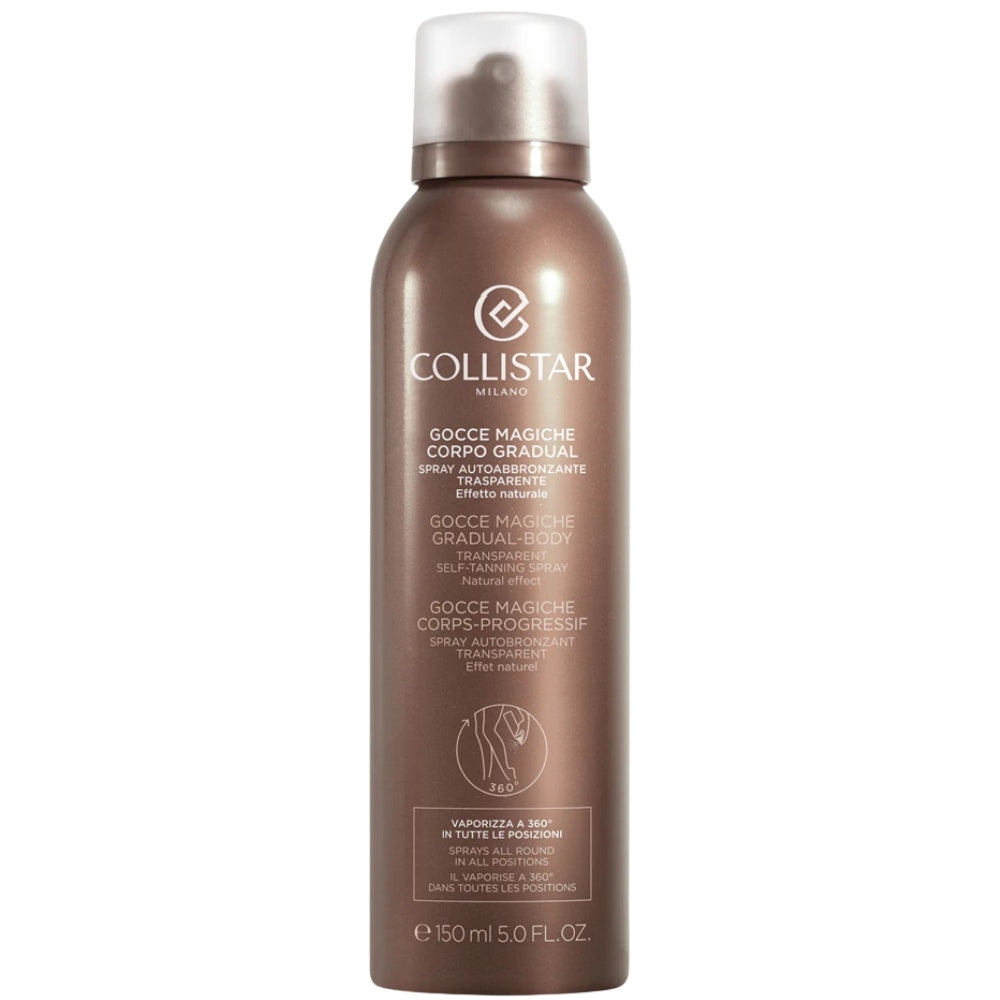 Collistar Magic Drops Gradual Body is een egale zelfbruiner voor het lichaam. Het product zorgt voor een gelijkmatige bruining zonder vlekken. De spray formule geeft de huid een stralend en gehydrateerd resultaat en is gemakkelijk en praktisch aan te brengen op zelfs moeilijk bereikbare plekken. De formule bevat DHA, vitamine E en hydraterende aloë voor een zijdezachte en gladde huid. Het product is speciaal voor lichaam en geschikt voor alle huidtypes. Ook voor mannen geschikt.