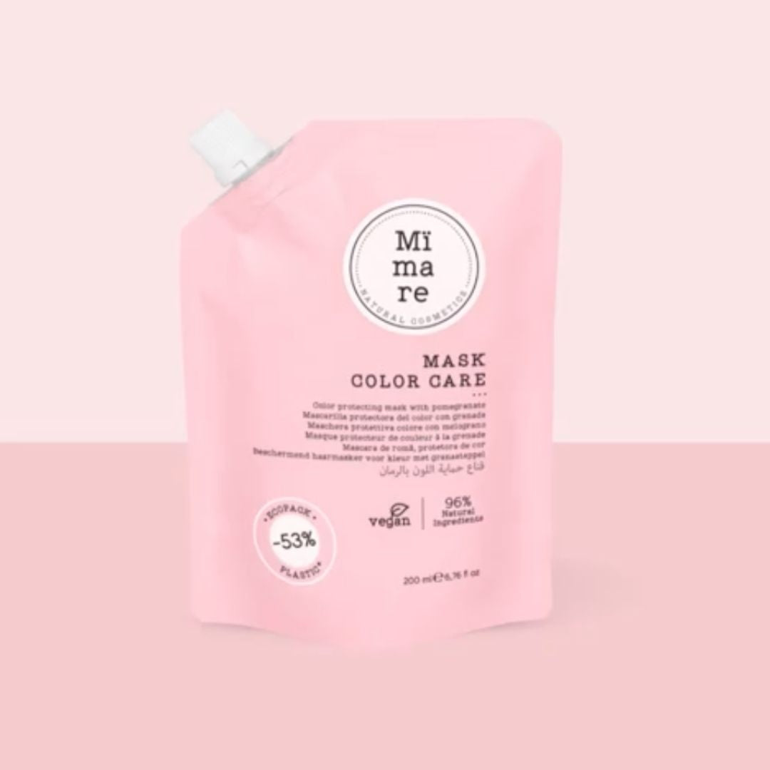 Die Mïmare Color Care Mask ist eine intensiv pflegende Haarmaske, die speziell für coloriertes Haar entwickelt wurde. Hast du eine frische Farbe oder gerade eine Auffrischung bekommen? Dann möchtest du natürlich, dass deine schöne Farbe so lange wie möglich leuchtet! Diese Maske nährt dein Haar intensiv, schützt deine Haarfarbe vor dem Verblassen und lässt sie glänzen wie nie zuvor. Die vegane Formel, die natürlichen Inhaltsstoffe und die nachhaltige Verpackung mit 53% weniger Plastik machen sie zu einer bewussten Pflegeentscheidung.