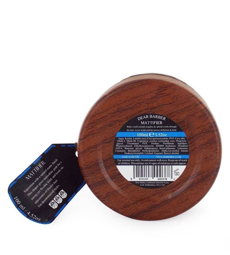 Dear Barber Mattifier packt das Haar und schafft sofort einen gesunden und vollen Haarschopf. Das matte Finish und die Tatsache, dass dieses Stylingprodukt nicht aushärtet, verleiht Ihrem Haar einen natürlichen Look. Die speziellen Inhaltsstoffe in diesem Mattifier pflegen auch Ihr Haar und verhindern, dass es austrocknet. Da der Mattifier wie eine Beschichtung auf Ihrem Haar liegt, schützt er Ihr Haar vor Feuchtigkeitsaufnahme und hält Ihr Haar noch länger in Form. Das Produkt hat einen wunderbar maskulinen Duft und lässt sich leicht auswaschen.