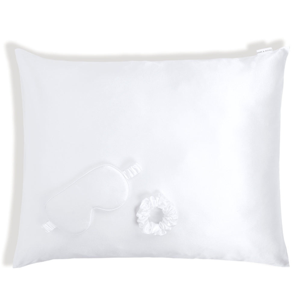 Das Dore & Rose Sleep Bundle White macht deine Haut sichtbar ruhiger, glatter und frischer und sorgt dafür, dass dein Haar am Morgen weniger kraus und kaputt ist. Dank der Kombination aus einem Seidenkissenbezug, einer Schlafmaske und einem Haargummi erlebst du einen kompletten Schönheitsschlaf.
