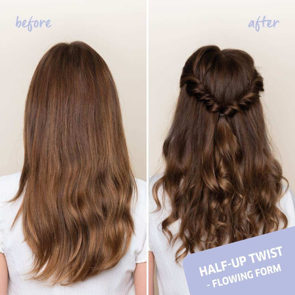 2 bis 5 Pumphübe Flowing Form auf die Hände geben und mit den Fingern in die mittleren Längen und Spitzen des Haares einarbeiten. Durchkämmen und anschließend mit einer Bürste trocken föhnen.