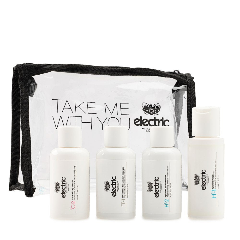 Das Electric Take Me With You Kit ist das Must-have für alle Beauty-Fans unterwegs. Egal, ob Sie einen Wochenendtrip planen, mit dem Rad ins Fitnessstudio fahren oder ein stylisches Geschenk suchen – dieses reisefreundliche Set bietet alles, was Ihr Haar braucht, in kompakter Größe. Das Kit enthält vier beliebte, TSA-zugelassene Electric-Produkte, perfekt verpackt in einem transparenten Kulturbeutel mit Reißverschluss. Kompakt, praktisch und luxuriös – bereit für unterwegs.