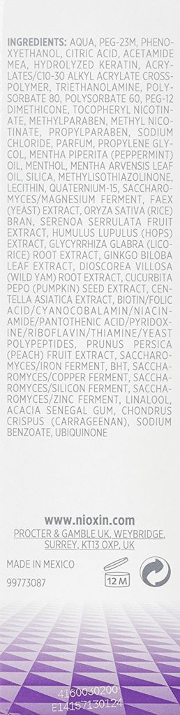Aqua/Wasser/Eau, Phenoxyethanol, Benzylalkohol, PEG-23M, Acetamid MEA, Acrylate/C10-30 Alkylacrylat-Crosspolymer, PEG-12 Dimethicon, Triethanolamin, Polysorbat 80, Polysorbat 60, Natriumbenzoat, Tocopherylnicotinat, Methylnicotinat, Mentha Arvensis Blattöl, Parfum/Duftstoff, Natriumchlorid, Propylenglykol, Kieselsäure, Mentha Piperita (Pfefferminz) Öl, PEG-30 Dipolyhydroxystearat, Limonen, Lecithin, Serenoa Serrulata Fruchtextrakt, Humulus Lupulus (Hopfen) Extrakt, Chondrus Crispus (Carrageen) Extrakt, Prunus Persica (Pfirsich) Saft, Centella Asiatica Extrakt, Cucurbita Pepo (Kürbis) Samenextrakt, Dioscorea Villosa (Wilde Yamswurzel) Wurzelextrakt, Glycyrrhiza Glabra (Süßholz)-Wurzelextrakt, BHT, Kaliumsorbat.
