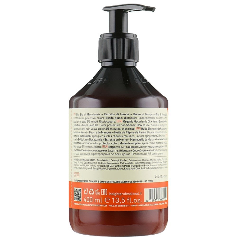 Insight Colored Hair Protective Conditioner schützt das Haar vor äußeren Einflüssen, die das Haar und die Haarfarbe beeinträchtigen können. Auch dieses Insight-Produkt besteht hauptsächlich aus natürlichen Inhaltsstoffen, wie Macadamiaöl, Weizenkeimöl, Olivenbutter, Arganöl, Reiskleieöl und Phytokomplex. Diese Inhaltsstoffe nähren und schützen Ihr Haar. Inhaltsstoffe wie Henna-Extrakt, Mangobaum und Traubenkernöl verlängern die Lebensdauer von Haar und Farbe. Die Pflegespülung pflegt das Haar intensiv, macht es weich und geschmeidig und erleichtert die Kämmbarkeit. Wie alle Produkte von Insight enthält auch die Insight Schutzspülung für gefärbtes Haar keine SLS, Mineralöle, Parabene, Silikone, künstlichen Farb- oder Duftstoffe, die allergische Reaktionen hervorrufen könnten. Die Wirkung der Spülung kommt am besten zur Geltung, wenn sie mit dem Insight Protective Shampoo für coloriertes Haar kombiniert wird. Für noch mehr Farbschutz empfiehlt es sich, die Schutzmaske in Kombination mit den anderen Produkten der Serie zu verwenden.