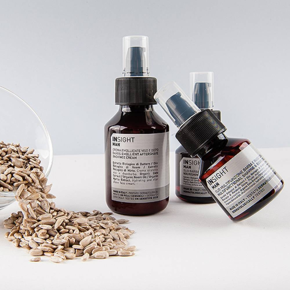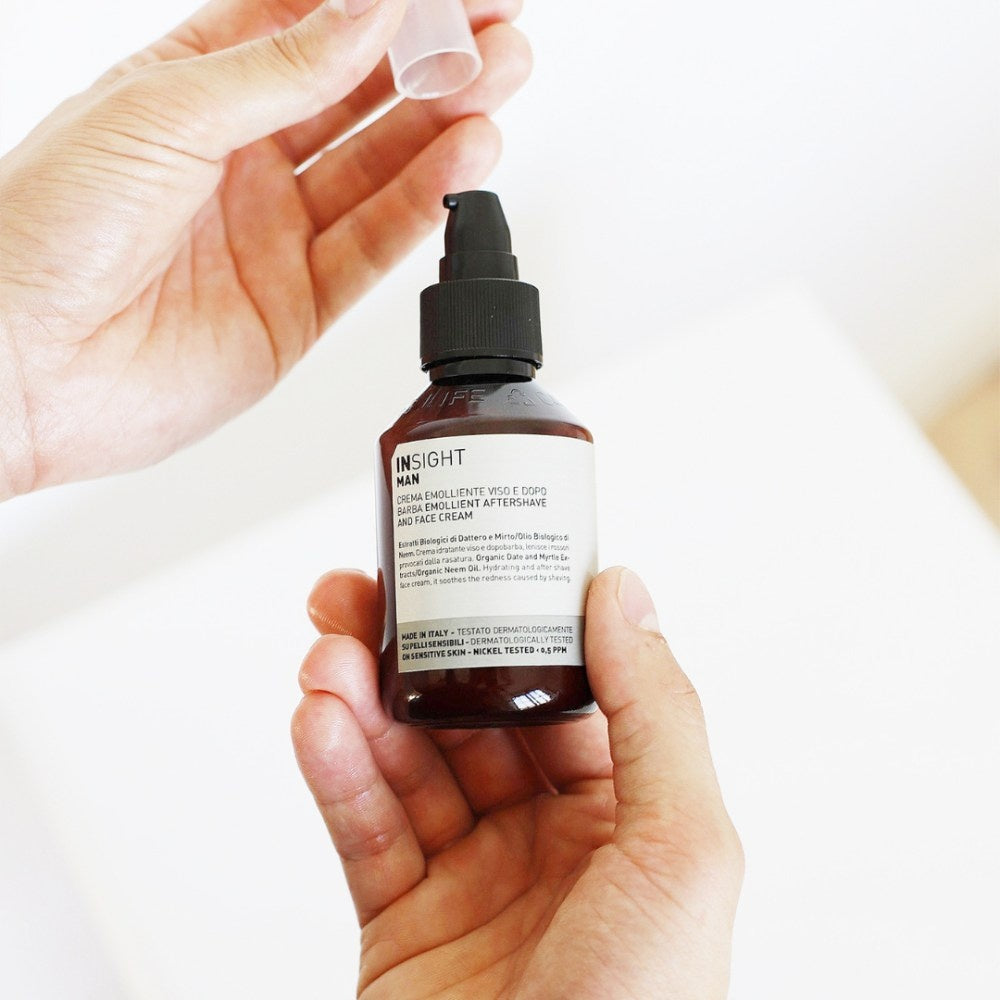 Die Insight Man Emollient Aftershave & Face Cream ist eine beruhigende Lotion mit feuchtigkeitsspendender Wirkung. Sie bringt die Hydrolipidschicht der Haut nach der Rasur wieder ins Gleichgewicht, ohne einen fettigen Film zu hinterlassen. Das Produkt ist speziell für alle Hauttypen entwickelt, selbst für die anspruchsvollste und empfindlichste Haut. Die Lotion beruhigt Hautirritationen und eignet sich für die tägliche Feuchtigkeitspflege. Die Aftershave & Face Cream ist angereichert mit biologischem Dattelfruchtextrakt, Bio-Neemöl und Bio-Myrtenextrakt für eine beruhigende Wirkung und zur Pflege der Haut nach der Rasur. Alle Insight-Produkte sind auf Nickel getestet, frei von Parabenen und Silikonen und 100% vegan.