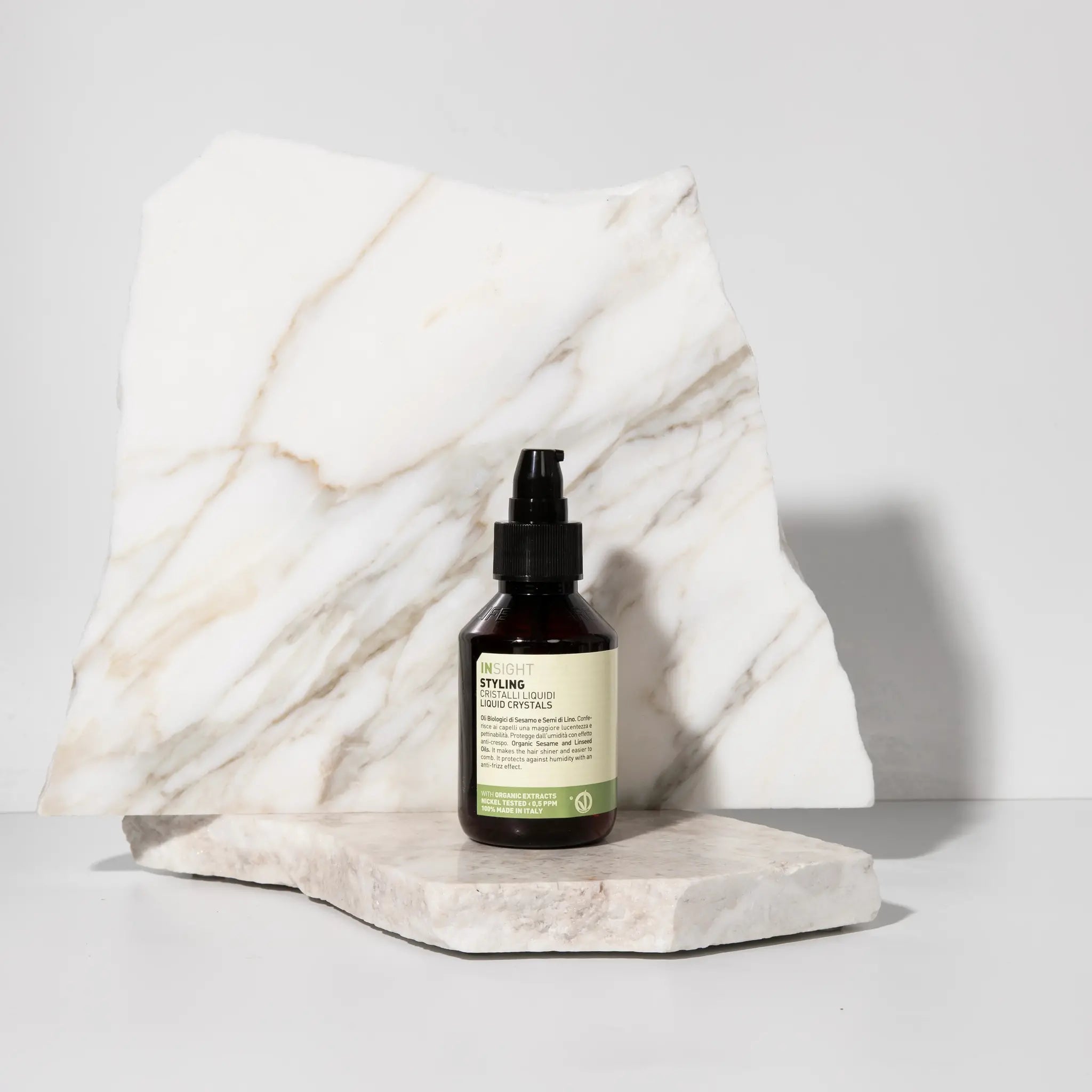 Insight Styling Liquid Crystals ist ein feuchtigkeitsspendendes Serum für dehydriertes und geschädigtes Haar. Das Produkt ist ideal, um Schäden zu reparieren und das Haar zu schützen. Insight Liquid Crystals spendet Feuchtigkeit und Pflege für alle Haartypen und schützt das Haar vor dem Austrocknen durch die Sonne oder Stylinggeräte. Nach der Anwendung des Serums glänzt das Haar wieder schön und lässt sich besser frisieren. Das Produkt sorgt für Klarheit und ultimative Feuchtigkeitszufuhr, ohne das Haar zu beschweren. Das Serum ist mit biologischem Sesam- und Leinöl angereichert. Diese pflegenden Inhaltsstoffe reduzieren auch die Feuchtigkeitsempfindlichkeit des Haares, so dass es weniger leicht kräuselt oder aus der Form fällt. Wie alle Produkte von Insight enthält auch dieses Produkt biologische Inhaltsstoffe und ist nickelgetestet. Außerdem enthält es keine SLS, SLES, Mineralöle, Parabene, Silikone, Farbstoffe und Allergene.