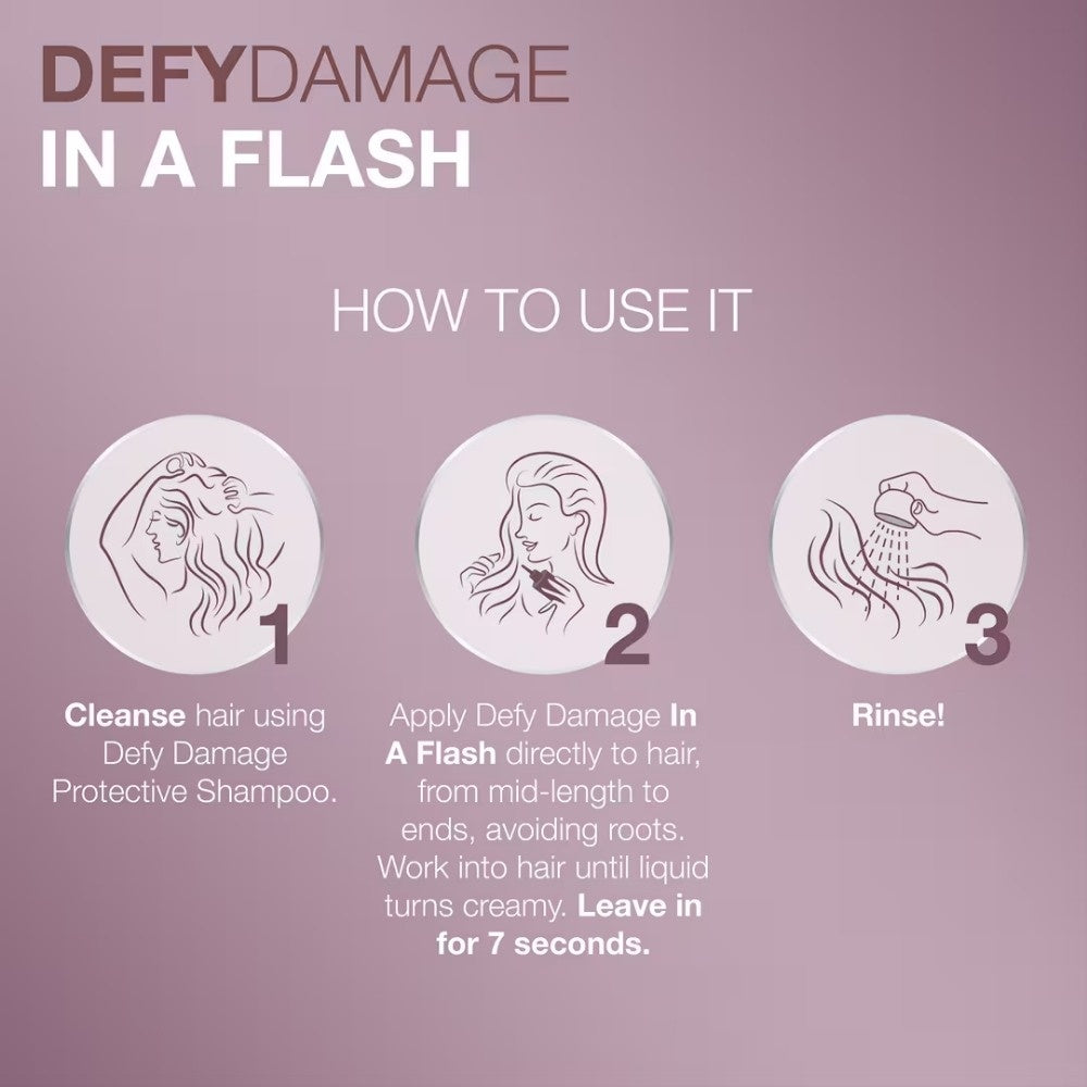 Verwende den Joico Defy Damage In A Flash 7-Second Bond Builder, nachdem du dein Haar gewaschen hast. Wir empfehlen dir, das begleitende Defy Damage Shampoo von Joico zu verwenden, bevor du dein Haar wäschst, um beste Ergebnisse zu erzielen.