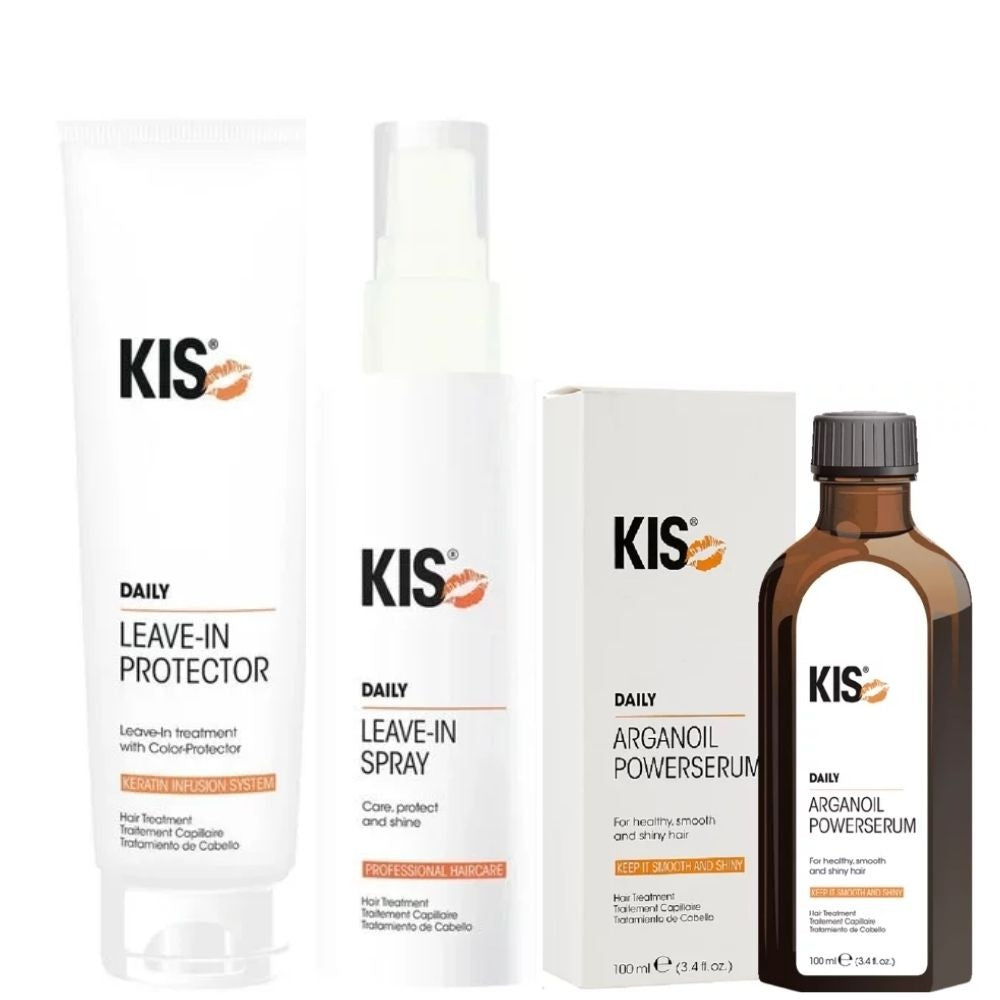 Suchst du nach einer einfachen Routine, um dein Haar jeden Tag gesund, glänzend und frizzfrei zu halten? Dann ist das KIS Daily Care Trio genau das Richtige für dich. Dieses komplette Set besteht aus drei Leave-in-Produkten, die dein Haar intensiv pflegen und schützen, ohne dass du etwas ausspülen musst. Egal, ob du coloriertes, trockenes, krauses oder kraftloses Haar hast, diese tägliche Haarpflege gibt deinem Haar den Boost, den es verdient. Die Produkte sind unter anderem mit Arganöl und Keratin angereichert und schützen vor Hitze, äußeren Einflüssen und Haarbruch.