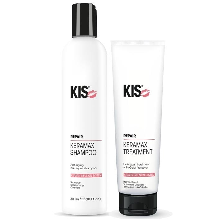 • KIS KeraMax Shampoo - 300ml: ist auf Kokosnussbasis und eignet sich hervorragend für geschädigtes, helleres oder brüchiges Haar. Es reinigt sehr sanft und hilft dem Haar, seinen Säureschutzmantel wiederherzustellen und zu erhalten. Baut die geschädigte Struktur wieder auf. Ideal als Grundlage für jede chemische Behandlung: sorgt für eine höhere Absorption dank der maximalen Zugabe von Haarkeratinproteinen.