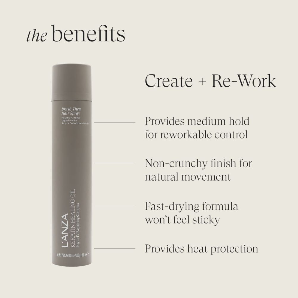 Das Brush Thru Hair Spray hält dein Haar mit einem mittleren Halt in Form, der den ganzen Tag anhält. Dein Haar bekommt einen wunderschönen Glanz, fühlt sich seidig weich an und bleibt frizzfrei, ohne an Volumen oder Bewegung einzubüßen.