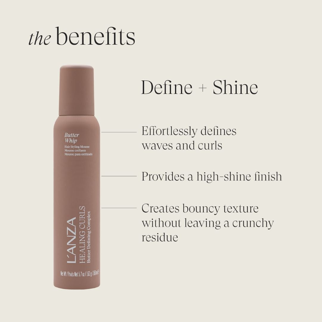 LANZA Healing Curls Butter Whip ist ein luxuriöses, leichtes Mousse, das speziell entwickelt wurde, um Locken zu definieren, sie mit Feuchtigkeit zu versorgen und Frizz zu reduzieren. Die leichte, cremige Formel ist mit Inhaltsstoffen angereichert, die die Lockenstruktur stärken und Ihr Haar weich und federnd halten. Perfekt für lockiges Haar, das zusätzliche Feuchtigkeit und Definition benötigt, ohne sich schwer oder beschwert anzufühlen.