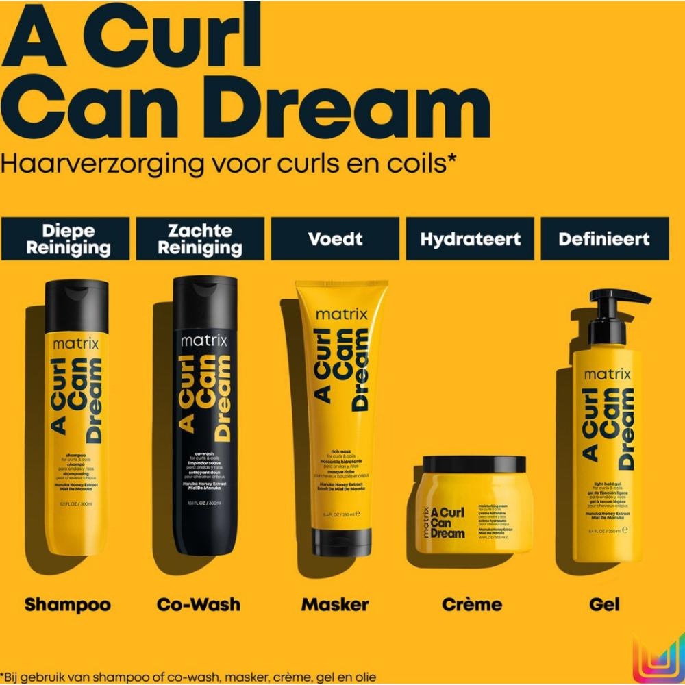 Matrix a Curl Can Dream Mask, die Haarmaske für traumhafte und schöne Locken. Verwöhne deine lockigen, gewellten oder krausen Locken mit der Matrix Curl Can Dream Treatment Mask. Diese Maske wurde speziell entwickelt, um deine Locken zu pflegen, zu nähren und ihnen die schöne Definition zu geben, von der du immer geträumt hast. Die natürliche Formel ist mit den Vorteilen von Manuka-Honig angereichert, der für seine weichmachenden Eigenschaften bekannt ist und deine Locken nicht nur schön, sondern auch gesund aussehen lässt.