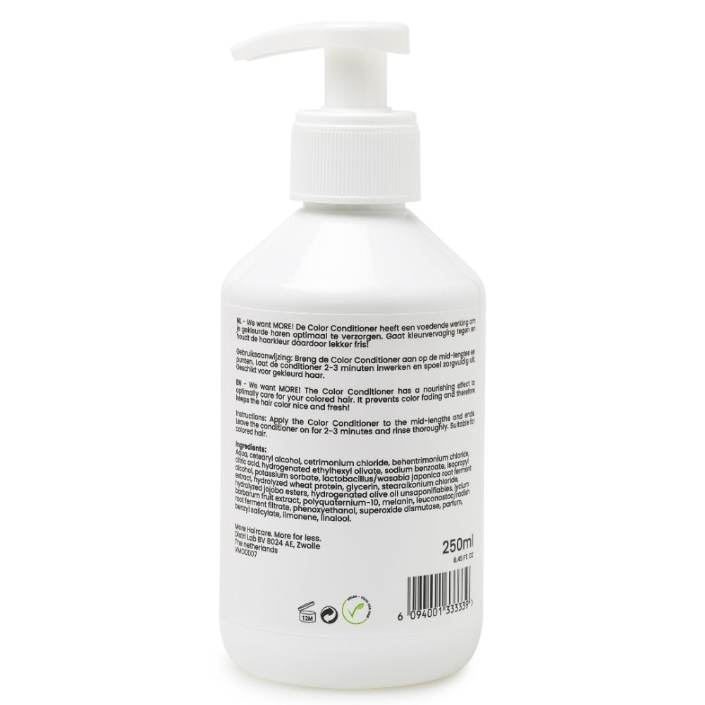 Der More Haircare Color Conditioner hat eine ultrapflegende und feuchtigkeitsspendende Wirkung, und das ist genau das, was dein gefärbtes Haar braucht! Die Haarschuppen werden geschlossen für ein glänzendes und weiches Ergebnis. Darüber hinaus wird dadurch dein Haar und deine Haarfarbe vor negativen Umwelteinflüssen geschützt. Dies verlängert die Haltbarkeit der Haarfarbe, sodass du deinen Friseurbesuch noch etwas hinauszögern kannst. Dank der einzigartigen Formel ohne Parabene, Sulfate und Silikone wird das Haar gestärkt, ohne es zu beschweren. Dein Haar sieht wieder gesund aus und hat eine lebendige Farbe, die länger hält!