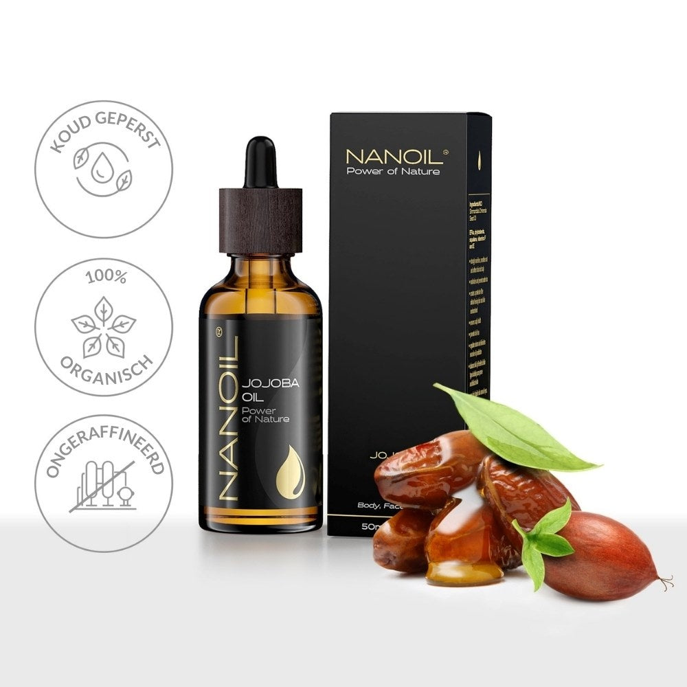 Nanoil Jojoba Oil ist ein kaltgepresstes, 100% biologisches und unraffiniertes Öl, das auch das Wüstengold der immergrünen Sträucher genannt wird. Jojobaöl wird aus Jojobasamen gewonnen. Jojobaöl enthält ungesättigte Fettsäuren (EFAs), pflanzliche Sterole und Anti-Aging-Eigenschaften, das bekannte Squalen, das die Hautfunktionen verbessert, sowie Vitamin E, das für die Verjüngung der Haut sorgt. Jojobaöl ist eigentlich ein flüssiges Wachs, das gut von der Haut aufgenommen wird und auch ein natürlicher UV-Filter ist. Es ähnelt in seiner Struktur dem menschlichen Talg, wirkt gegen Akne und ist ideal für geschwächtes Haar. Nanoil ist Ecocert-zertifiziert.