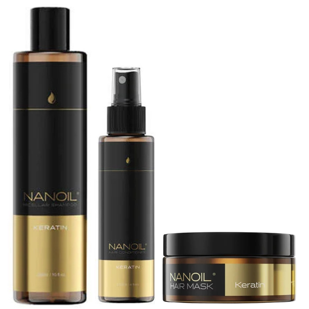 Nanoil Keratin Complete Set ist ein mit Keratin angereichertes Haarpflegeset, das speziell entwickelt wurde, um geschädigtes, sprödes und lebloses Haar wiederzubeleben. Das Set besteht aus den folgenden Produkten: