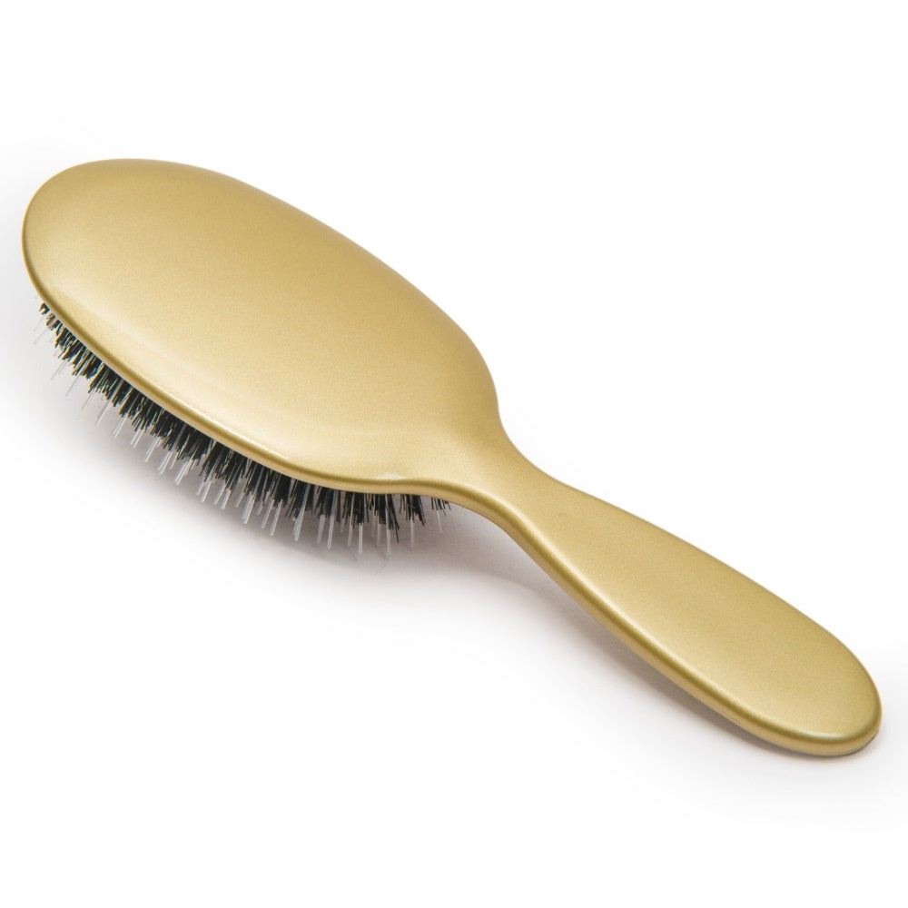 Diese Bürste besteht aus hochwertigen Materialien: robustem Kunststoff für eine langlebige Basis und natürlichen Wildschweinborsten, die dein Haar pflegen. Das goldene Finish macht die Bürste zu etwas ganz Besonderem. Schau immer auf der Verpackung nach, um mehr über die Materialien zu erfahren.