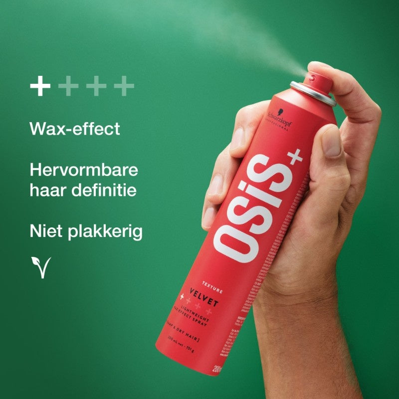 Schwarzkopf OSiS+ Texture Velvet ist ein leichtes Spray mit Wachseffekt, das dem Haar mehr Definition verleiht, ohne sich klebrig anzufühlen. Das Spray erzeugt einen Samteffekt und hinterlässt keine Fettigkeit im Haar. Das Spray hat einen leichten Halt und erzeugt dank des angereicherten Glycerins und Panthenols einen natürlichen Glanz.