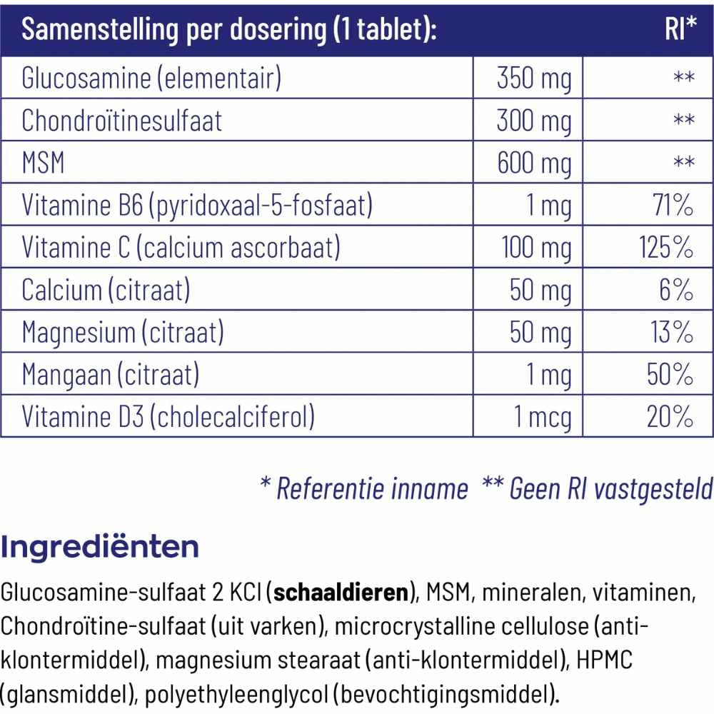 Glucosaminsulfat 2 KCl ( Schalentiere ), MSM, Mineralstoffe, Vitamine, Chondroitinsulfat (aus Schweinefleisch ), mikrokristalline Cellulose (Trennmittel), Magnesiumstearat (Trennmittel), HPMC (Überzugsmittel), Polyethylenglykol (Feuchthaltemittel)