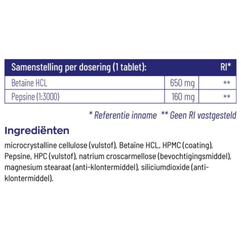 mikrokristalline Cellulose (Bindemittel), Betain HCL, HPMC (Beschichtung), Pepsin, HPC (Füllstoff), Croscarmellose-Natrium (Feuchthaltemittel), Magnesiumstearat (Trennmittel), Siliciumdioxid (Bindemittel).
