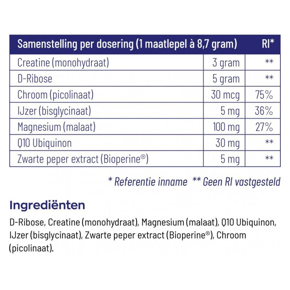 D-Ribose, Kreatin (Monohydrat), Magnesium (Malat), Q10 Ubiquinol, Eisen (Biglycinat), Schwarzer Pfefferextrakt (Bioperine®), Chrom (Picolinat).