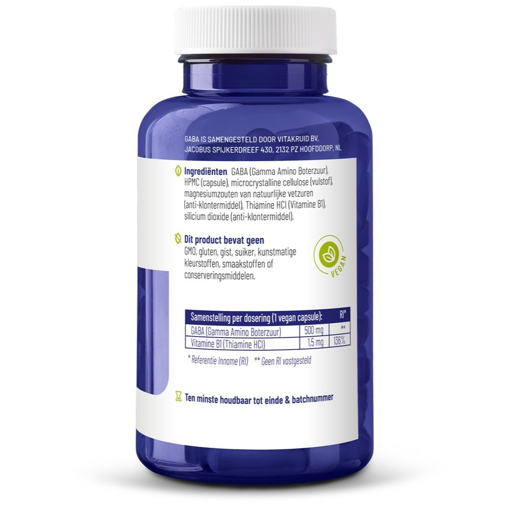 GABA wird aus der Aminosäure L-Glutamin gebildet. Auch Proteine ​​aus der Nahrung werden in L-Glutamin umgewandelt. Für diesen Umwandlungsprozess benötigt der Körper Kofaktoren wie Mineralstoffe, Vitamine und andere Substanzen. Vitamin B1 ist für diesen Umwandlungsprozess unerlässlich, weshalb die GABA-Formel von Vitakruid 1,5 mg Vitamin B1 enthält. Vitamin B1 wirkt sich auch positiv auf die Stimmung aus. Das Vitamin B1 wird natürlich in der leicht resorbierbaren Form Thiaminhydrochlorid zugesetzt. Für GABA haben wir uns für 500 mg reines, resorbierbares GABA entschieden.