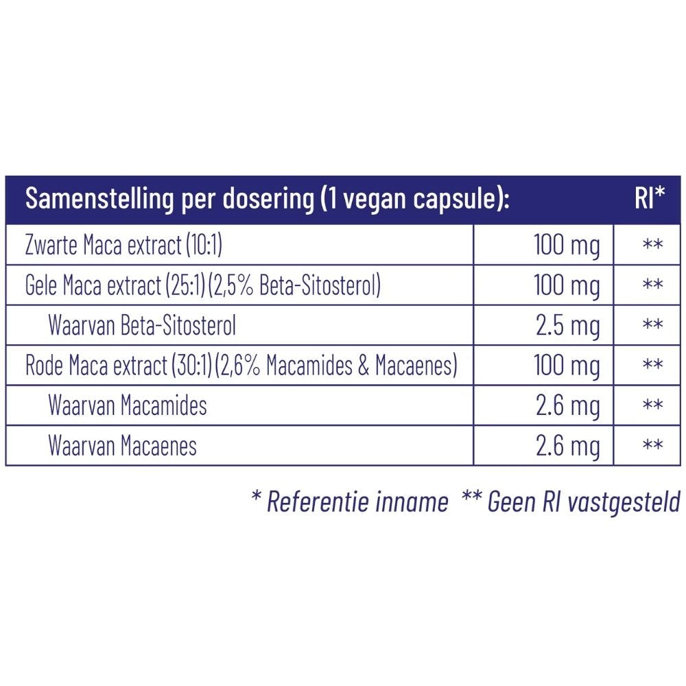 Schwarzer Maca-Extrakt (Lepidium meyenii), Gelber Maca-Extrakt (Lepidium meyenii), Roter Maca-Extrakt (Lepidium meyenii), HPMC (Kapsel), mikrokristalline Cellulose (Füllstoff), Magnesiumsalze natürlicher Fettsäuren (Trennmittel), Siliciumdioxid (Trennmittel).