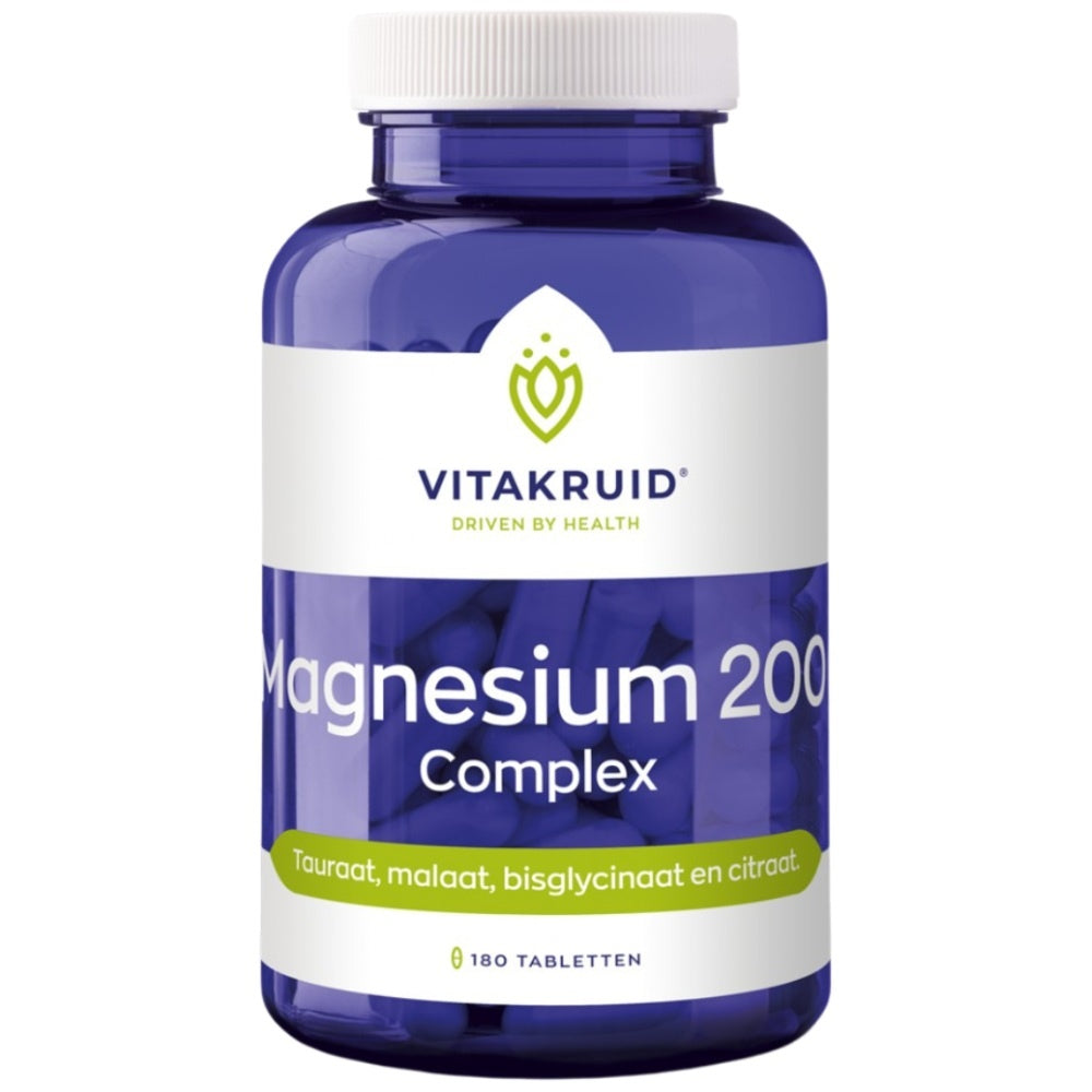 Magnesium 200 Complex ist ein vielseitiges Nahrungsergänzungsmittel. Es gibt verschiedene Arten von Magnesium. Unsere tägliche Ernährung enthält anorganisch gebundenes Magnesium; diese Formen von Magnesium kommen im Boden vor und werden von den Pflanzen aufgenommen, die wir täglich essen. Die besten Formen von Magnesium sind Magnesiumchelate wie Magnesiumtaurat, Magnesiummalat und Magnesiumbisglycinat. Die Struktur dieses Komplexes ist so stark, dass unsere Magensäfte ihn nicht zersetzen können. Dadurch wird sichergestellt, dass die Mineralien intakt in unseren Darm gelangen. Hier werden die wertvollen Substanzen dann von unserem Körper aufgenommen. Darüber hinaus lindert diese Form von Magnesium auch Magen-Darm-Beschwerden! Alle organischen und Aminosäure-Chelatformen von Magnesium werden in einem einzigen Nahrungsergänzungsmittel angeboten. Die Kombination von Magnesiumbisglycinat und -taurat verbessert die Stimmung und die Konzentration. Diese Kombination erleichtert es Magnesium auch, die Blut-Hirn-Schranke zu überwinden. Vitamin B6 sorgt dafür, dass Magnesium gut vom Körper aufgenommen wird, was sicherlich nicht unwichtig ist! B6 hat viele weitere gesundheitliche Vorteile, einschließlich seiner positiven Wirkung auf die Produktion roter Blutkörperchen und die Proteinsynthese. Schließlich hat Vitakruid dem Magnesium 200 Complex auch Magnesiummalat und -citrat hinzugefügt. Dies wirkt sich positiv auf Symptome wie Müdigkeit und verminderte Muskelfunktion aus.
