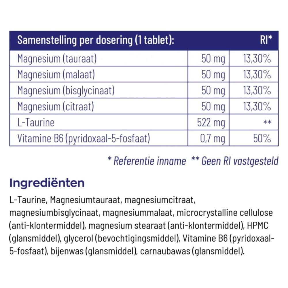 Magnesiumtaurat, Magnesiumcitrat, Magnesiumbisglycinat, Magnesiummalat, mikrokristalline Cellulose (Trennmittel), Magnesiumstearat (Trennmittel), HPMC (Überzugsmittel), Glycerin (Feuchthaltemittel), Vitamin B6 (Pyridoxal-5-phosphat), Bienenwachs (Überzugsmittel), Carnaubawachs (Überzugsmittel).