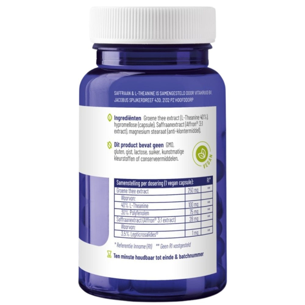 Vitakruid Safran & L-Theanin mit 28 mg Safran hilft Ihnen beim Entspannen und fördert einen erholsamen Schlaf. L-Theanin, der Extrakt aus Kameliengrüntee, ist gut für das Energieniveau und sorgt für ein frisches, waches Gefühl. Es wirkt sich auch positiv auf das Immunsystem aus. Die ultimative Kombination aus L-Theanin und Safran ergibt eine wirksame Formel, da sich die Extrakte perfekt ergänzen. Safran in Form von Safran fördert das geistige Gleichgewicht. Affron® wurde aufgrund seiner hohen Qualität bewusst für die Vitakruid-Formel ausgewählt und ist auf 3,5 % Lepticrosalide standardisiert. Darüber hinaus besteht diese Variante aus 100 % echtem Safran, sodass Sie ein natürliches und reines Nahrungsergänzungsmittel verwenden können.