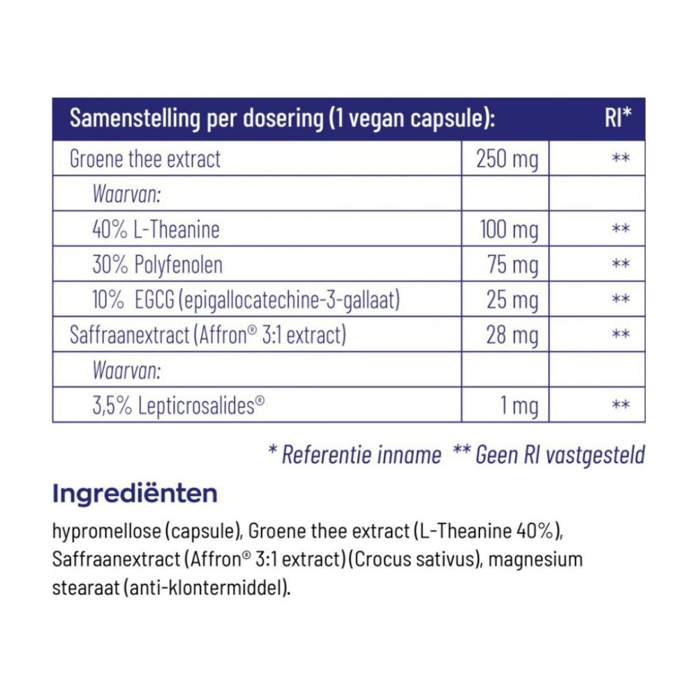 Hypromellose (Kapsel), Grüntee-Extrakt (L-Theanin 40 %), Safran-Extrakt (Affron® 3:1-Extrakt) (Crocus sativus), Magnesiumstearat (Trennmittel).