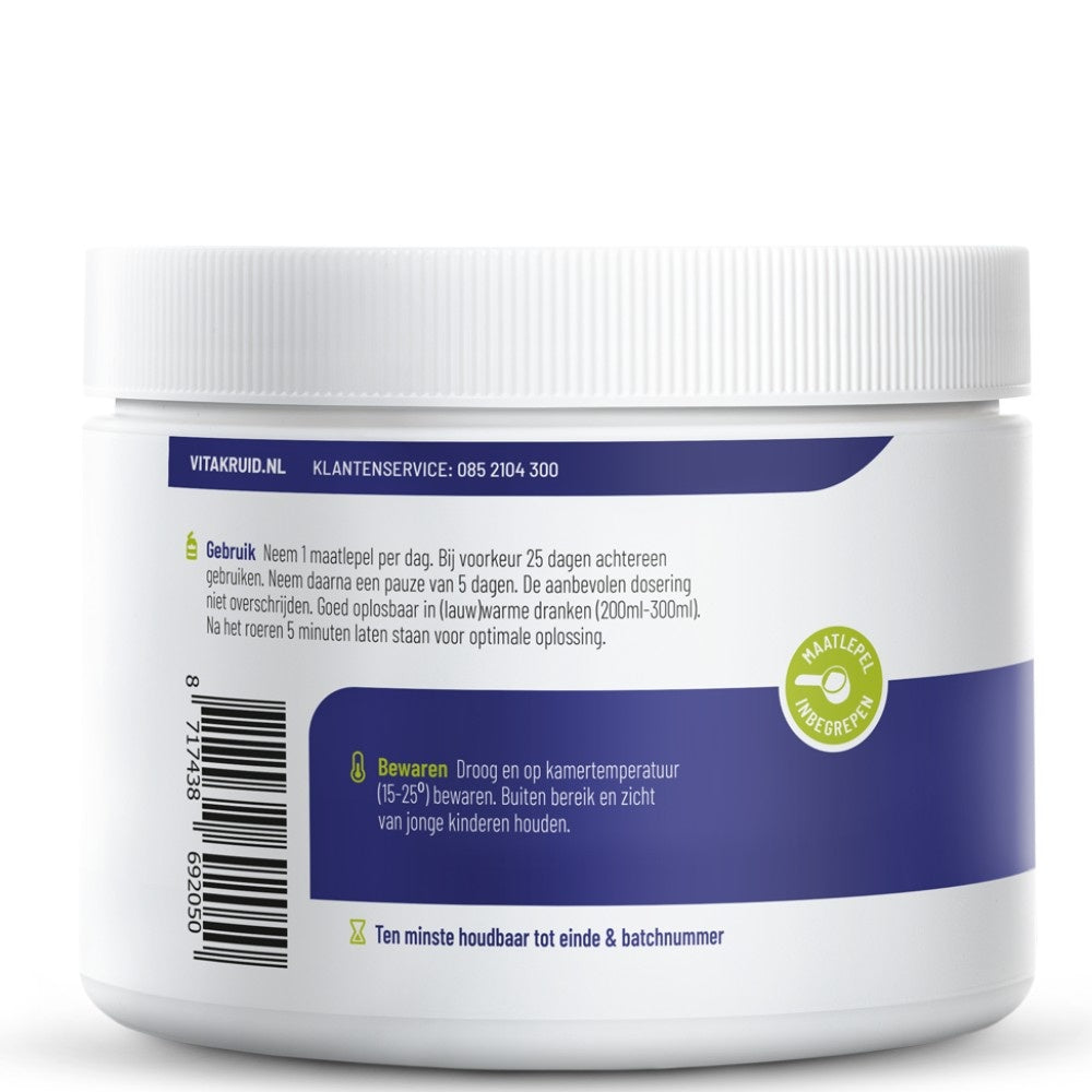 Vitakruid 99 % reines Fischkollagen eignet sich hervorragend für straffe und elastische Haut. Kollagen ist ein wichtiges Protein für unseren Körper und macht satte 30 % unseres Gesamtproteins aus! Es kommt in allen möglichen Geweben Ihres Körpers vor, wie Haut, Muskeln, Blutgefäßen, Knorpel und Sehnen. Bis zum Alter von 25 Jahren produzieren Sie selbst Kollagen. Danach nimmt die Produktion ab. Daher ist es sinnvoll, Ihren Körper durch die Einnahme von zusätzlichem Kollagen zu unterstützen. Wenn die Kollagenproduktion nachlässt, werden die ersten Zeichen der Hautalterung sichtbar, und wir möchten diese natürlich etwas hinauszögern!