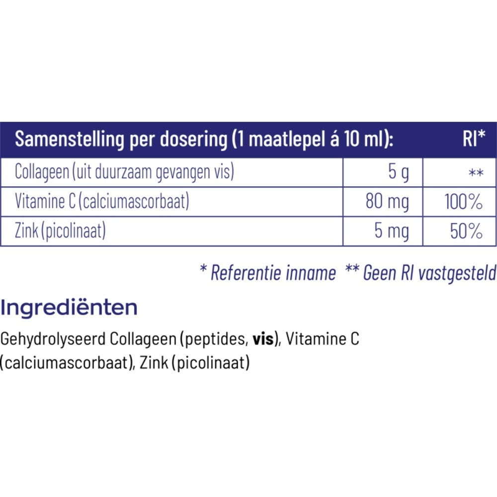 Hydrolysiertes Kollagen (Peptide, Fisch), Vitamin C (Calciumascorbat), Zink (Picolinat)