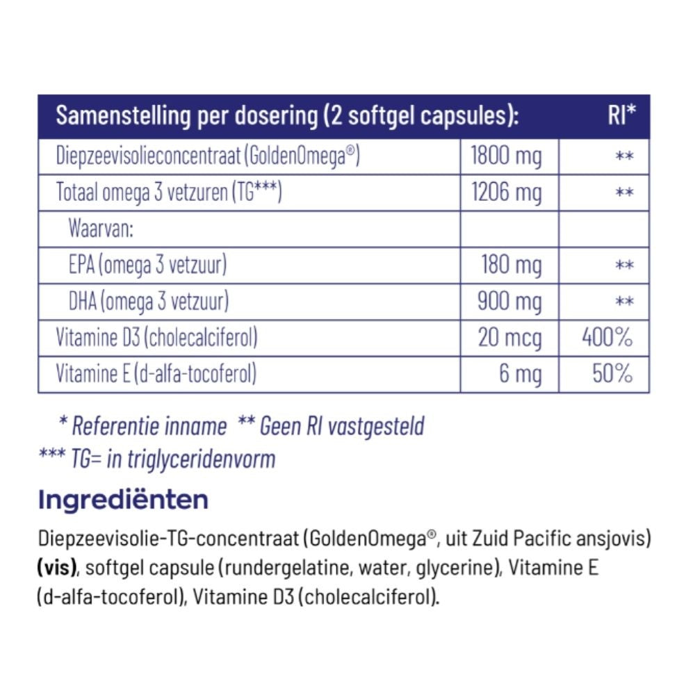 Zutaten: Tiefseefischölkonzentrat (GoldenOmega®, aus südpazifischen Sardellen) (Fisch), Weichkapsel (Rindergelatine, Wasser, Glycerin), Vitamin E (D-Alpha-Tocopherol), Vitamin D3 (Cholecalciferol).