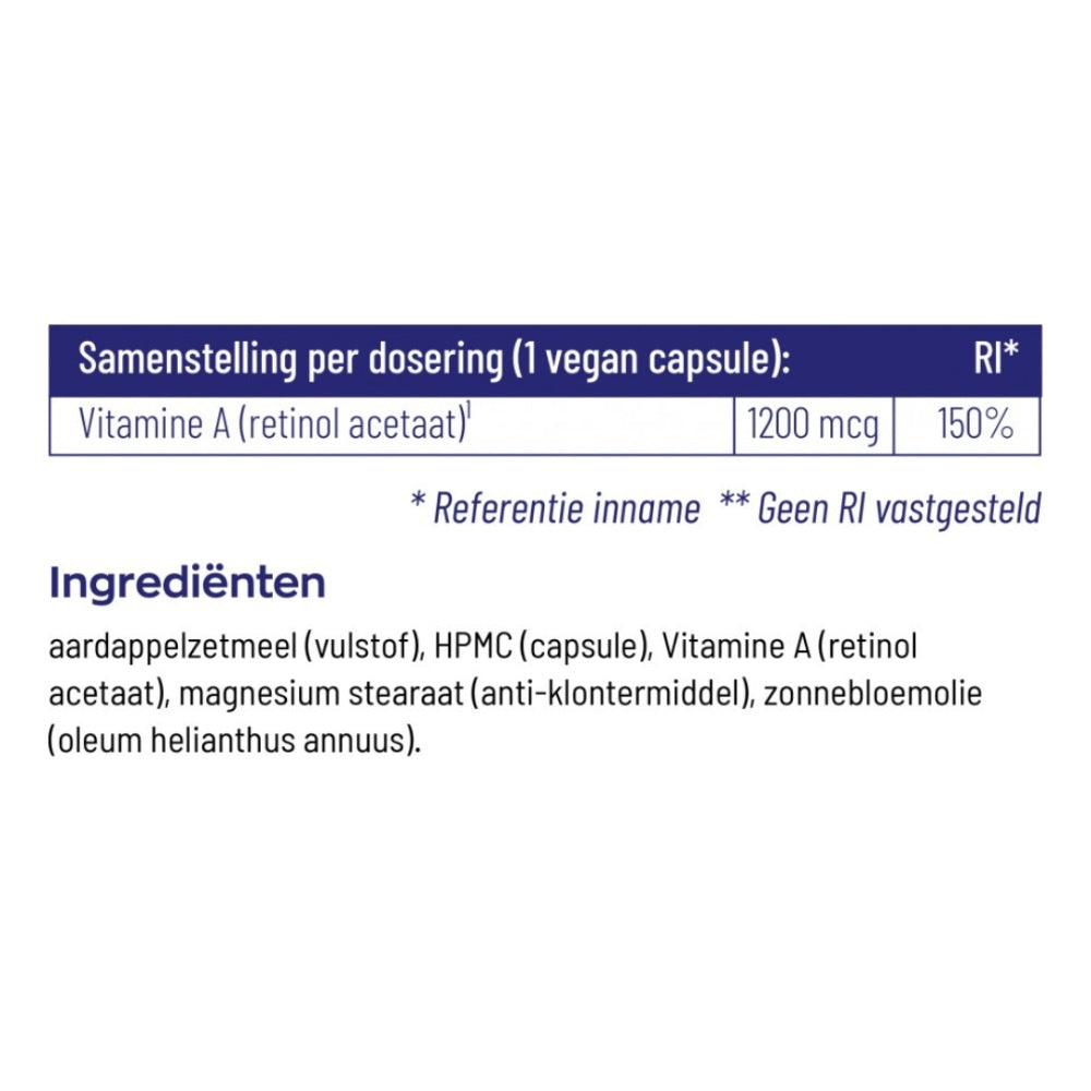Kartoffelstärke (Füllstoff), HPMC (Kapsel), Vitamin A (Retinolacetat), Magnesiumstearat (Trennmittel), Sonnenblumenöl (Oleum Helianthus Annuus).