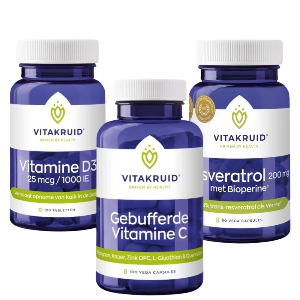 Mit dem Vitakruid Basic Resistance Bundle hast du eine solide Grundlage (kombiniert mit einem gesunden Lebensstil), um das ganze Jahr über gesund zu bleiben. Es ist kein Geheimnis, dass es in den Niederlanden ziemlich kalt und nass werden kann. Gerade zu dieser Jahreszeit ist es wichtig, sich gesund zu ernähren, um alle Vitamine zu erhalten und den Körper gut gegen Viren zu wappnen. Um deinen gesunden Lebensstil zu unterstützen, kannst du zusätzliche Vitamine einnehmen. Denke an Vitamin D3 (die sonnigen Monate können in den Niederlanden recht selten sein), Resveratrol zur Unterstützung der Herz-Kreislauf-Gesundheit und gepuffertes Vitamin C, das eine komplette Formel für die Immunität enthält. Ob Regen oder Sonnenschein, du bleibst das ganze Jahr über gesund!