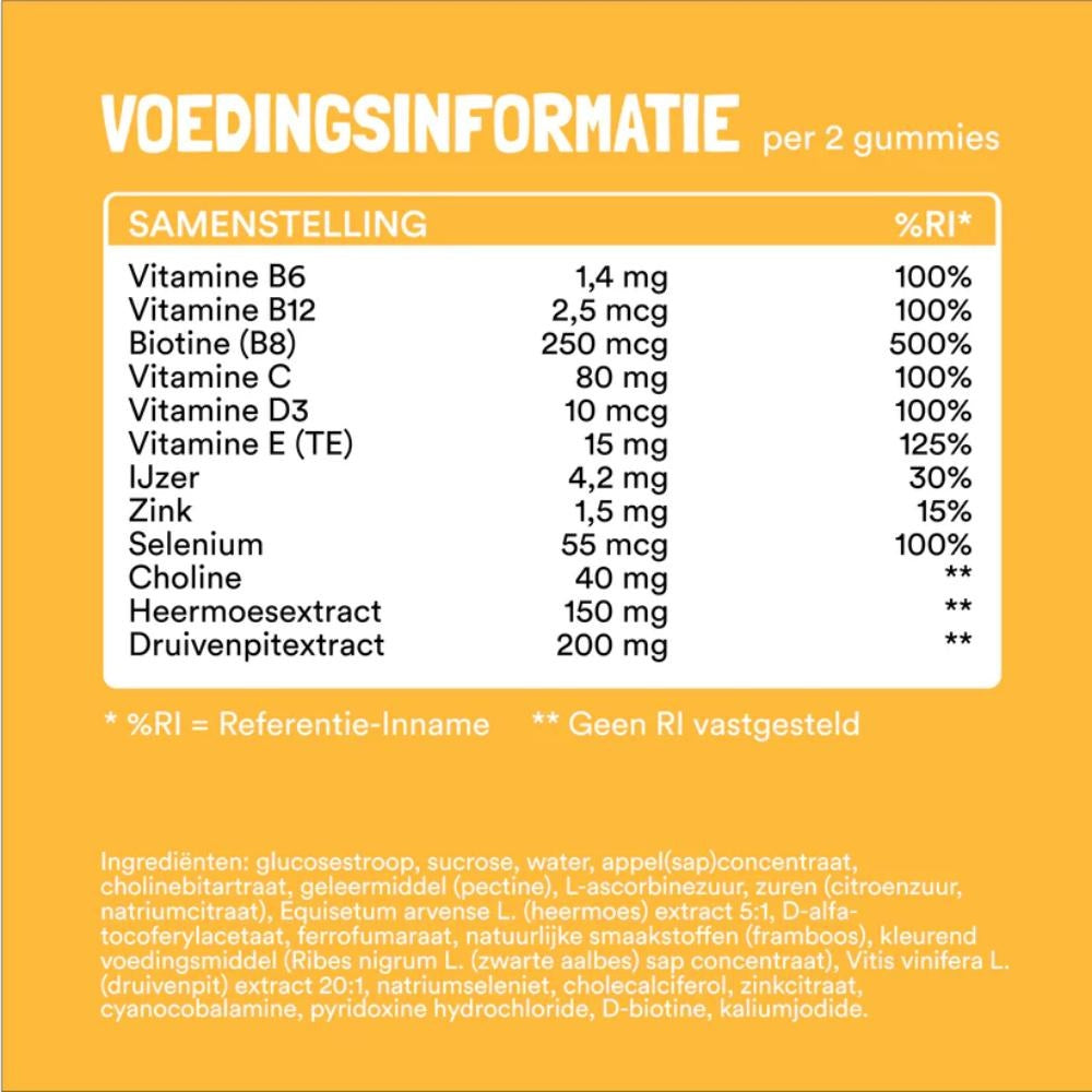 Zutaten: Glukosesirup, Saccharose, Wasser, Apfelsaftkonzentrat, Cholinbitartrat, Pektin, L-Ascorbinsäure (Vitamin C), Zitronensäure, Natriumcitrat, Schachtelhalmextrakt 5:1, D-alpha-Tocopherylacetat (Vitamin E), Eisenfumarat (Eisen), natürliche Aromen (Himbeere), Farbstoff (Schwarzes Johannisbeerkonzentrat), Traubenkernextrakt 20:1, Natriumselenit, Cholecalciferol (Vitamin D3), Zinkcitrat, Cyanocobalamin (Vitamin B12), Pyridoxinhydrochlorid (Vitamin B6), D-Biotin (Vitamin B8), Kaliumiodid.
